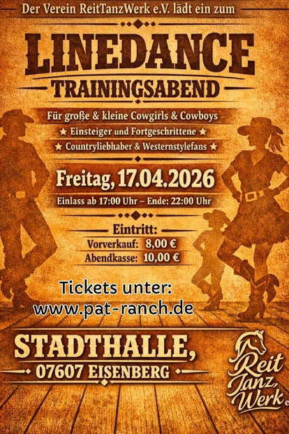 Wir laden alle Linedance-Begeisterten herzlich zu unserem Trainingsabend ein! Egal, ob du Anfänger oder Fortgeschrittener bist, dieser Abend bietet die perfekte Gelegenheit, deine Linedance-Fähigkeiten zu verbessern, neue Schritte zu lernen und Gleichgesinnte zu treffen. Vorbereitet sind spannende Choreografien und viel Spaß auf der Tanzfläche. Verpasse nicht die Chance, in einer freundlichen und motivierenden Atmosphäre zu tanzen. Wir freuen uns auf deine Teilnahme!
